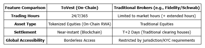 Comparison to ToVest: While Webull offers extended hours, ToVest provides true 24/7 on-chain trading and specific support for tokenized assets.