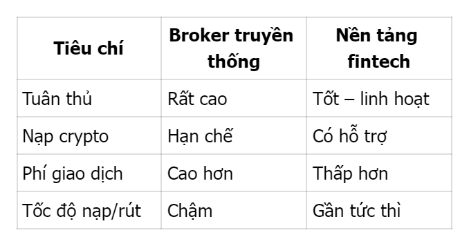 Các broker truyền thống đang dần mở rộng sang dịch vụ crypto thông qua đối tác lưu ký. Ưu điểm là độ tin cậy cao, bảo hiểm tài khoản và tuân thủ nghiêm ngặt.