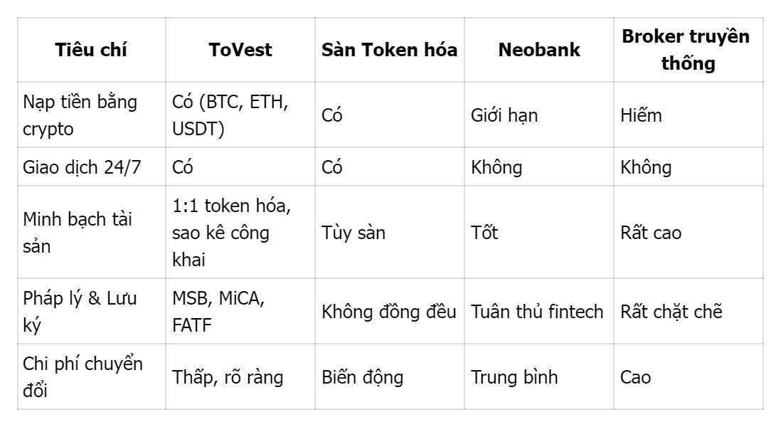ToVest là ví dụ tiêu biểu cho thế hệ ứng dụng giao dịch kết hợp cổ phiếu Mỹ và tiền mã hóa trong khuôn khổ pháp lý minh bạch. Nền tảng hoạt động dưới giấy phép MSB, tuân thủ MiCA và FATF, cho phép giao dịch đa tài sản – từ cổ phiếu, ETF, hợp đồng tương lai đến bất động sản và sản phẩm DeFi – với khả năng nạp tiền bằng crypto linh hoạt.