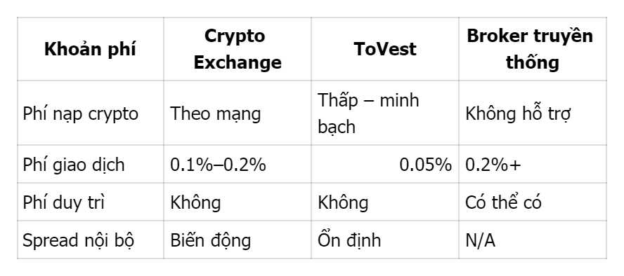 Bao gồm phí nạp/rút, phí chuyển đổi, spread và phí giao dịch; ToVest công bố minh bạch tại trang biểu phí.