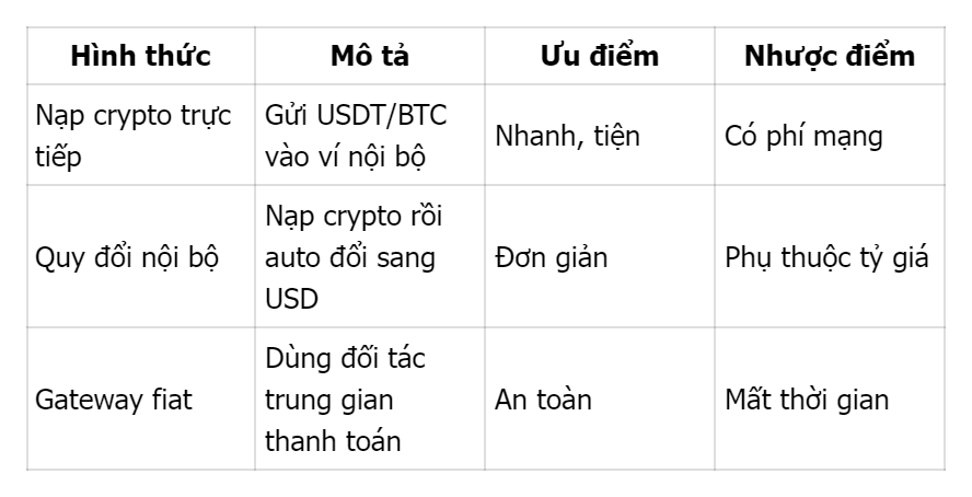 Một số nền tảng quốc tế hỗ trợ nạp stablecoin rút gọn, tuy nhiên tỷ giá chuyển đổi có thể thay đổi nhanh khi mạng blockchain tắc nghẽn.