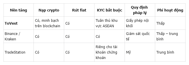 ToVest nổi bật ở khả năng kết nối giao dịch tài sản token hóa, minh bạch trên blockchain và tuân thủ quy định vùng Đông Nam Á — giúp nhà đầu tư yên tâm hơn khi chuyển đổi giữa crypto và cổ phiếu, đồng thời tối ưu chi phí giao dịch lâu dài.