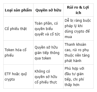 - Pháp lý: Token hóa hoặc ETF có thể gặp giới hạn chuyển nhượng hoặc bị yêu cầu tuân thủ điều khoản nghiêm ngặt.