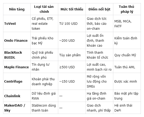 Blockchain đã mở đường cho mô hình “đầu tư cổ phiếu lẻ trên blockchain”, nơi mọi loại tài sản thực có thể được chia nhỏ, giao dịch và theo dõi minh bạch trực tuyến. Bảng dưới đây so sánh nhanh các nền tảng tiêu biểu: