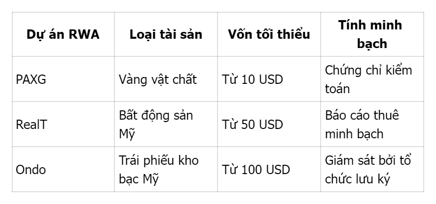 Nhà đầu tư nhỏ nên bắt đầu từ các loại RWA có tính ổn định cao như vàng (PAXG, XAUT) hoặc bất động sản cho thuê (Lofty, RealT). Các nền tảng này đều công bố chứng nhận kiểm toán và báo cáo minh bạch chứng minh mỗi token được bảo đảm bằng tài sản thật.