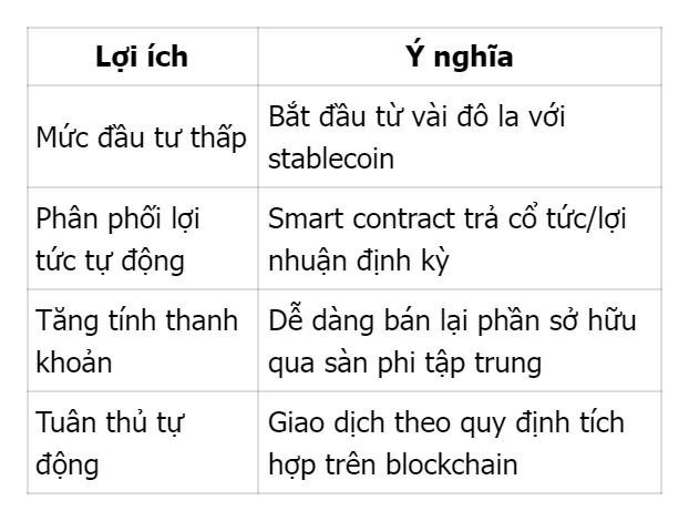 - Thu nhập tự động: Smart contract tự động phân phối lợi suất từ tiền thuê, cổ tức hoặc lãi suất.