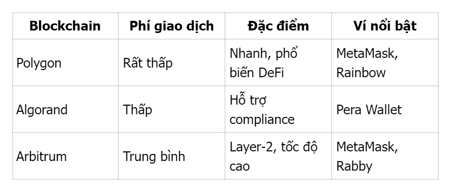 Lựa chọn blockchain có tốc độ nhanh, phí thấp và tuân thủ pháp lý tốt như Polygon hoặc Algorand giúp tiết kiệm chi phí giao dịch. Nên chọn ví hỗ trợ stablecoin (như MetaMask, Tangem, Trust Wallet) để kết nối với DApp đầu tư.