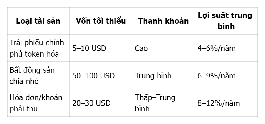 Khi đầu tư với vốn thấp, việc chọn đúng loại tài sản RWA có tính thanh khoản cao và rủi ro thấp là ưu tiên hàng đầu. Một số lựa chọn phổ biến cho nhà đầu tư Việt Nam: