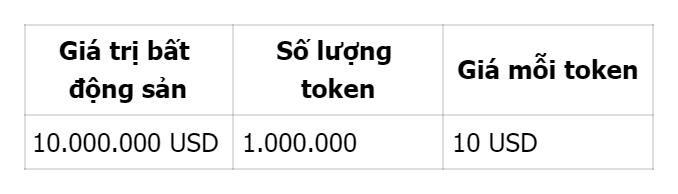 Ví dụ, nếu một bất động sản trị giá 10 triệu USD được chia thành 1 triệu token, mỗi token sẽ có giá 10 USD.