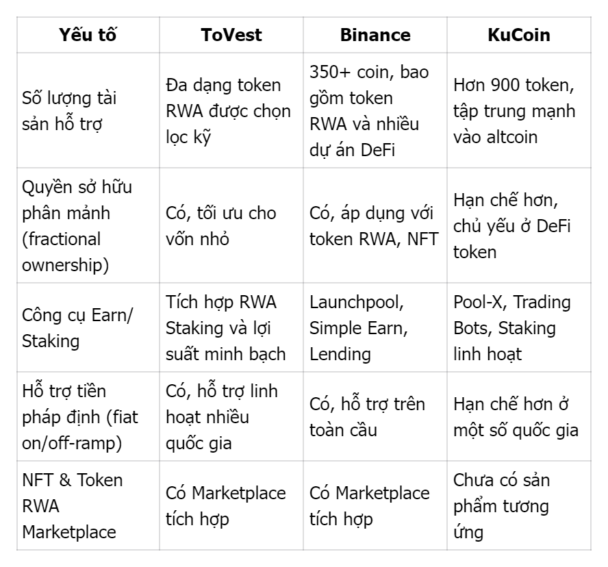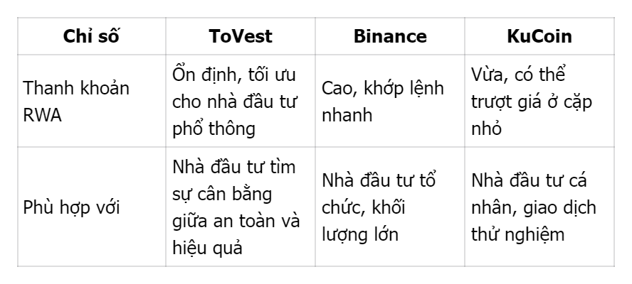 ToVest hướng đến trải nghiệm đầu tư RWA dễ tiếp cận với chi phí minh bạch, Binance mang đến hệ sinh thái toàn diện cho nhà đầu tư lớn, trong khi KuCoin phù hợp với nhà giao dịch thích khám phá token mới.