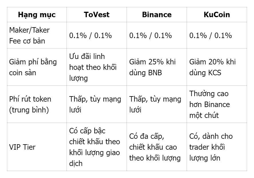 Phí cơ bản khoảng 0.1% cho mỗi lệnh, có thể giảm với chương trình ưu đãi hoặc coin sàn; ToVest tự động tối ưu mức phí minh bạch cho người dùng.