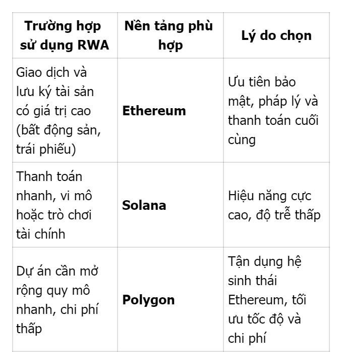 Ethereum đảm bảo tính bảo mật nhưng chịu hạn chế về tốc độ và chi phí nếu không tích hợp Layer-2. Trong khi đó, Solana và Polygon vượt trội về tốc độ, cho phép triển khai RWA dạng vi mô hoặc giao dịch tần suất cao mà không lo chi phí bào mòn lợi nhuận.