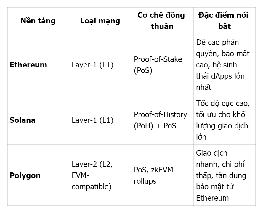Ethereum vận hành dựa trên cơ chế đồng thuận Proof-of-Stake sau “The Merge” năm 2022, giúp giảm tiêu thụ năng lượng và tăng bảo mật. Solana lại chọn hướng đi riêng với Proof-of-History để sắp xếp giao dịch nhanh chóng, đạt hiệu suất vượt trội. Trong khi đó, Polygon được xây dựng như lớp mở rộng (Layer-2) của Ethereum, kết hợp trải nghiệm EVM quen thuộc với chi phí cực thấp và tốc độ gần như tức thì.