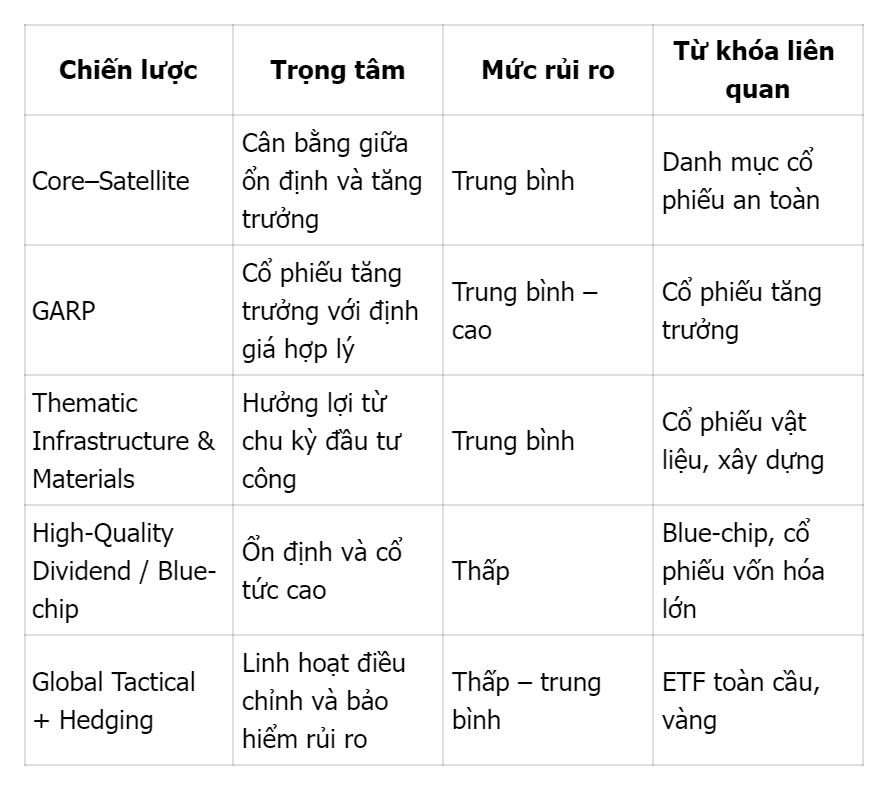 Chiến lượcLợi ích chínhRủi ro chínhCore–SatelliteCân bằng giữa an toàn và tăng trưởngLựa chọn sai nhóm lõiGARPTăng trưởng ổn định, ít rủi ro định giáDễ bỏ lỡ cổ phiếu tăng nóngThematicHưởng lợi xu hướng vĩ môRủi ro đảo chiều chính sáchBlue-chipỔn định, thu nhập đềuTăng giá chậmHedgingGiảm biến động, bảo toàn vốnChi phí cơ hội cao
