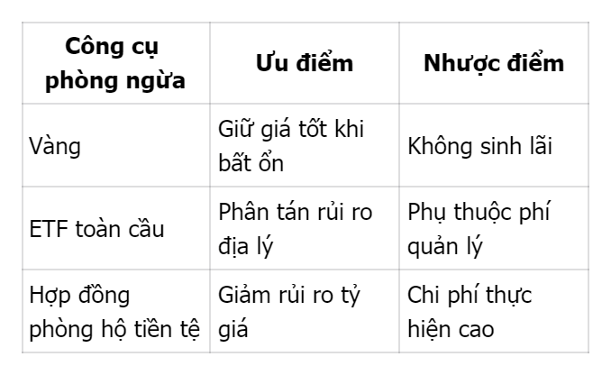 Bao gồm ETF toàn cầu, vàng, hợp đồng phái sinh và công cụ phòng hộ tỷ giá, giúp bảo vệ danh mục khỏi biến động mạnh.