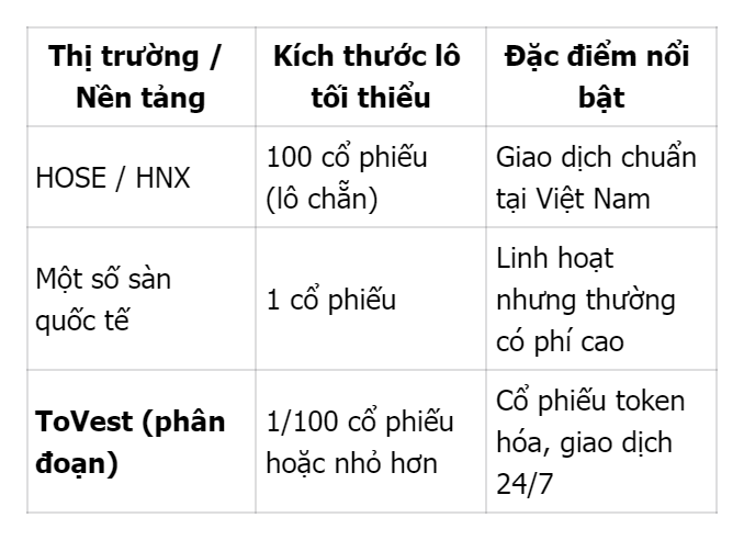 Những yêu cầu này tác động trực tiếp đến số vốn cần thiết. Với ToVest, quy mô lô nhỏ và mô hình cổ phiếu lẻ giúp giảm rào cản tài chính, đặc biệt hỗ trợ nhà đầu tư mới dễ dàng bắt đầu.