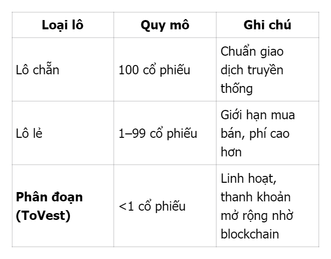 Tùy sàn, thường là 100 cổ phiếu/lô; với ToVest, bạn có thể bắt đầu chỉ từ 100.000–500.000 VNĐ nhờ cổ phiếu phân đoạn.