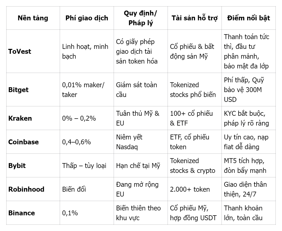 Cổ phiếu token hóa đang mở ra kỷ nguyên đầu tư xuyên biên giới, cho phép nhà đầu tư toàn cầu giao dịch các mã cổ phiếu Mỹ mọi lúc, mọi nơi. Nhờ công nghệ blockchain, mỗi token đại diện cho một phần của cổ phiếu hoặc quỹ ETF truyền thống, mang lại tính linh hoạt, minh bạch và khả năng giao dịch 24/7. Tuy nhiên, các nền tảng khác nhau về độ an toàn, chi phí và tuân thủ pháp lý — yếu tố đặc biệt quan trọng với nhà đầu tư ngoài Mỹ. Dưới đây là 6 nền tảng tokenized stocks hàng đầu năm 2026, giúp bạn hiểu rõ sự khác biệt và chọn lựa phù hợp cho chiến lược đầu tư toàn cầu.