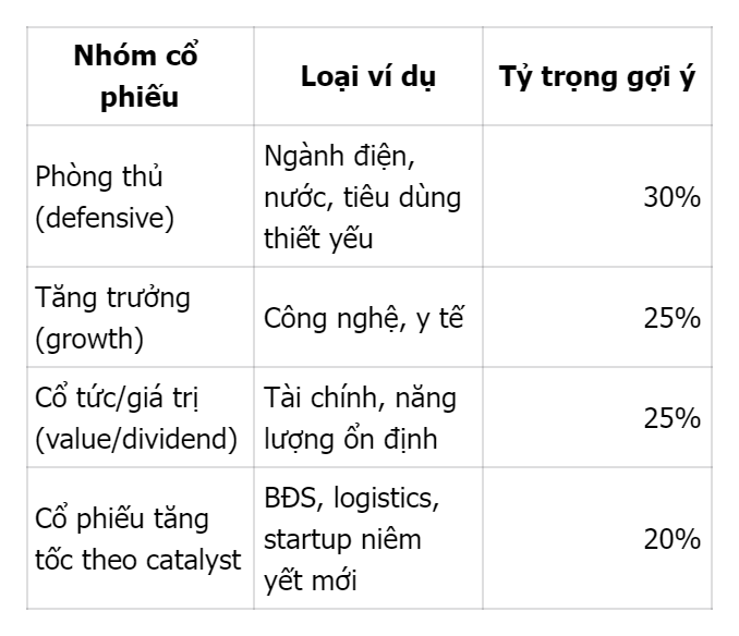 Một khung phân bổ danh mục cổ phiếu phổ biến năm 2026 có thể gồm: