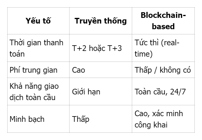 Hệ thống truyền thống mất 2–3 ngày để hoàn tất giao dịch, trong khi token hoá cho phép thanh toán ngay lập tức. Điều này giảm chi phí lưu ký, rủi ro chuyển khoản và tăng khả năng xoay vòng vốn cho nhà đầu tư.