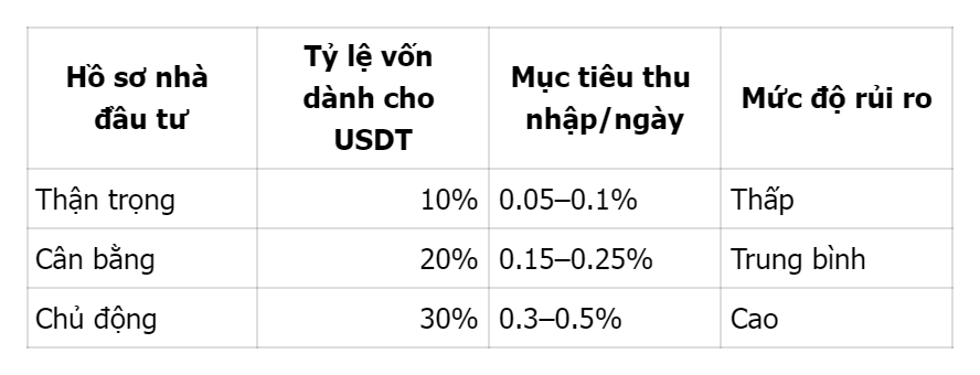 Một chiến lược đầu tư USDT bền vững cần cân bằng giữa lợi suất và bảo toàn vốn. Trong năm 2026, nhiều nhà đầu tư chuyên nghiệp áp dụng mô hình ba nhóm phân bổ:
