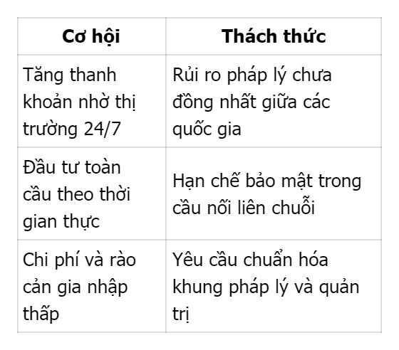 Blockchain mang lại khả năng giao dịch xuyên biên giới thực sự — không còn rào cản múi giờ hay hệ thống trung gian. Với công nghệ này, nhà đầu tư tại Việt Nam có thể mua cổ phiếu token hóa của các tập đoàn Mỹ, châu Âu hoặc châu Á bất kỳ lúc nào.