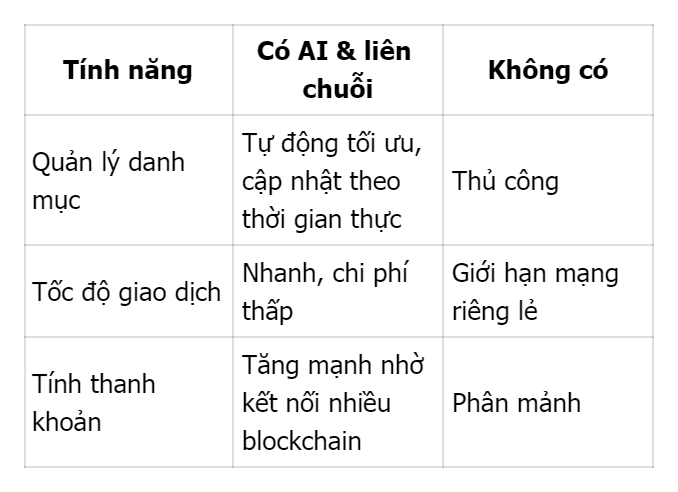 AI được tích hợp vào hợp đồng thông minh để tự động phân tích dữ liệu, cân bằng danh mục và tối ưu hóa rủi ro. Trong khi đó, liên chuỗi cho phép các blockchain khác nhau trao đổi tài sản và thông tin liền mạch.