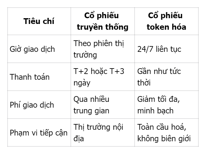 Cổ phiếu token hóa giúp giao dịch nhanh, giảm phí, mở rộng tiếp cận và tăng tính minh bạch toàn cầu.