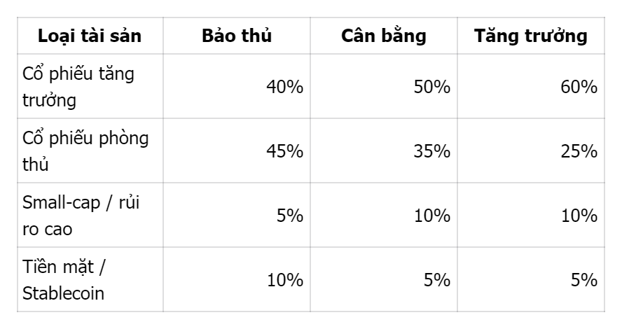 Phân bổ danh mục là yếu tố quyết định hiệu quả dài hạn. Dưới đây là mô hình tham khảo:
