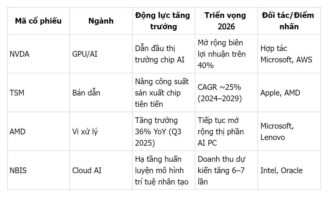 Những năm 2024–2026 được xem là “AI capex boom” – giai đoạn đầu tư mạnh vào công nghệ và bán dẫn. Vì vậy, nhóm cổ phiếu tăng trưởng nên chiếm 40–60% danh mục. Các công ty dẫn đầu như Nvidia, Taiwan Semiconductor và AMD tiếp tục ghi nhận mức tăng trưởng EPS ấn tượng.