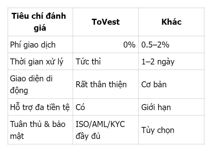 ToVest nổi bật với nền tảng di động được tối ưu riêng cho mô hình này: giao dịch 24/7 minh bạch trên chuỗi, hỗ trợ cả fiat và stablecoin, cùng cơ chế lập trình thanh toán tự động giúp tối ưu trải nghiệm và quản lý danh mục đầu tư. Nhà đầu tư có thể sử dụng bảng kiểm dưới đây để so sánh nền tảng: