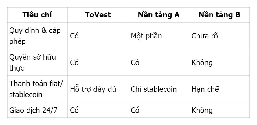 Hãy chọn nền tảng có quy định rõ ràng, sở hữu thực, tuân thủ KYC/AML và hợp tác với đơn vị lưu ký được cấp phép như ToVest.