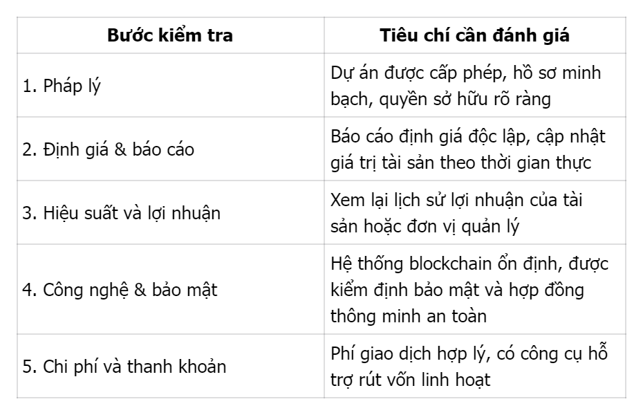 Khi tham gia vào thị trường token hóa tại Việt Nam, điều quan trọng là chọn dự án an toàn, minh bạch và tuân thủ pháp lý. Nhà đầu tư nên đi theo checklist sau: