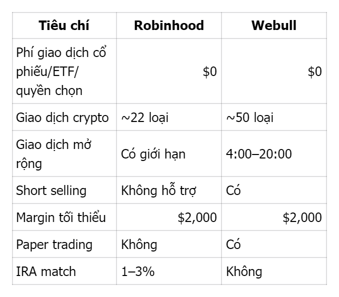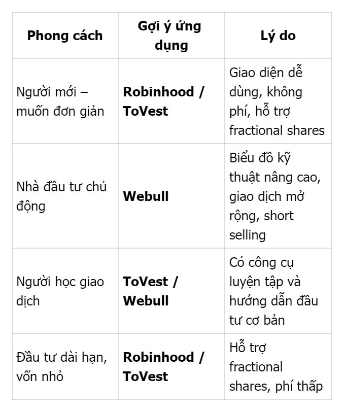 Cả hai ứng dụng đều miễn phí hoa hồng, song vẫn có phí quy định nhỏ theo yêu cầu của FINRA. Robinhood phù hợp hơn cho người thích đơn giản; Webull hấp dẫn với ai muốn trải nghiệm công cụ chuyên sâu. ToVest cũng duy trì chính sách minh bạch tương tự, đồng thời tập trung cân bằng giữa dễ dùng và tính năng học tập cho người mới.