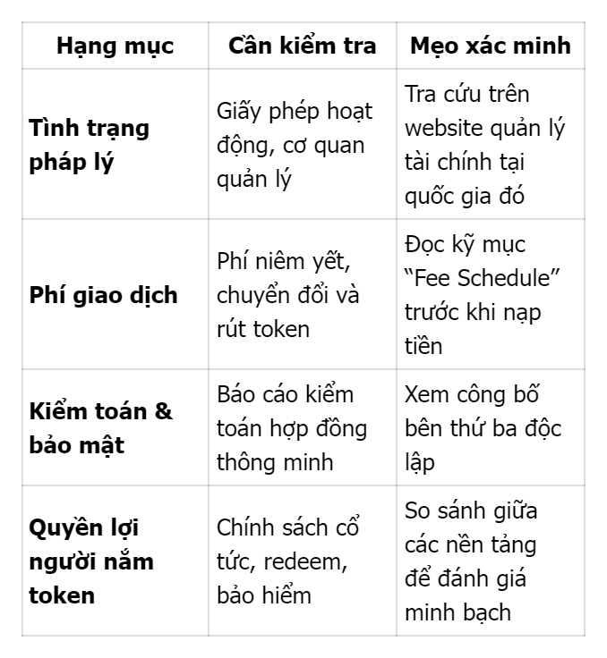 Trước khi giao dịch token cổ phiếu, hãy tiến hành đánh giá pháp lý và chi phí toàn diện. Một vài tiêu chí quan trọng gồm: