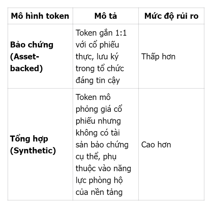 - Rủi ro đối tác & nền tảng: Nếu nhà phát hành hoặc sàn bị lỗi thanh khoản, nhà đầu tư có thể mất kết nối với tài sản gốc.