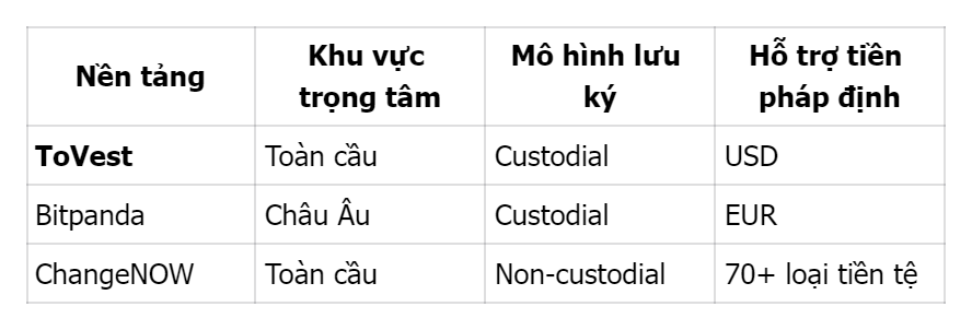 Bitpanda đang mở rộng vai trò trong thị trường RWA châu Âu với hạ tầng mới – Vision Chain L2 – dùng để phát hành tài sản được token hóa. Với mô hình fully custodial, Bitpanda đáp ứng các tiêu chuẩn pháp lý EU, đặc biệt tối ưu cho người dùng sử dụng EUR. Nền tảng cung cấp fiat onramp và hệ thống kiểm toán định kỳ, phù hợp với nhà đầu tư chú trọng đến sự ổn định pháp lý và vận hành trơn tru trong khuôn khổ châu Âu.