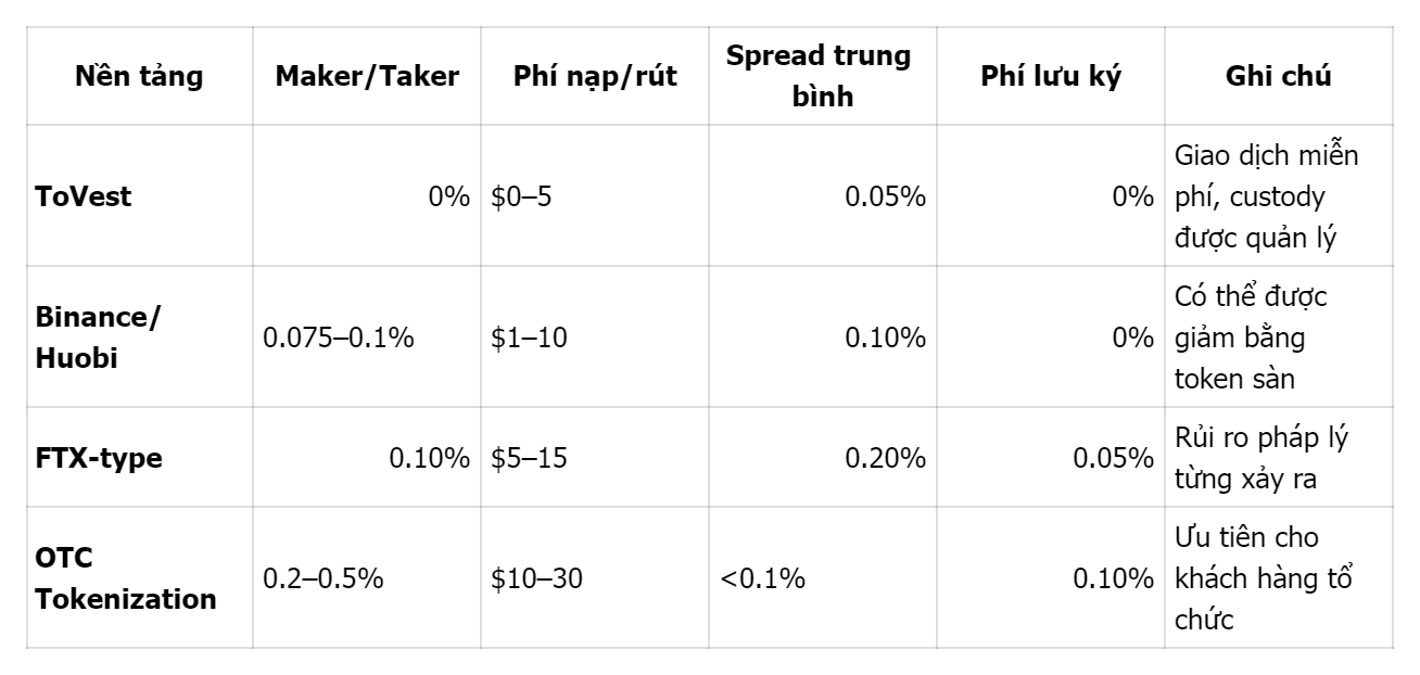 Binance và Huobi cung cấp thanh khoản mạnh, phí ưu đãi nếu thanh toán bằng token nội bộ (BNB, HT). Tuy nhiên, chi phí rút, spread và chuyển đổi giữa tokenized assets và cổ phiếu thực vẫn tồn tại. Tài sản được lưu ký tập trung nên có rủi ro phụ thuộc vào cơ chế bảo vệ của sàn, trong khi ToVest áp dụng mô hình lưu ký được quản lý độc lập nhằm giảm thiểu rủi ro này.