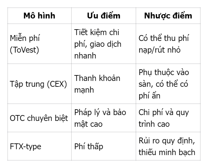 Thanh khoản cao giúp spread hẹp, giảm chi phí giao dịch. Nền tảng an toàn luôn áp dụng lưu trữ lạnh, xác thực đa chữ ký và lưu ký bởi bên thứ ba. Quy định pháp lý chặt chẽ – như giấy phép từ cơ quan quản lý – đảm bảo tính minh bạch, tránh rủi ro ngưng hoạt động. Dù mức phí có thể nhỉnh hơn, nhưng đổi lại là độ ổn định và bảo vệ người dùng lâu dài. ToVest tuân thủ tiêu chuẩn lưu ký và minh bạch tài sản, tạo sự an tâm cho nhà đầu tư cả cá nhân lẫn tổ chức.