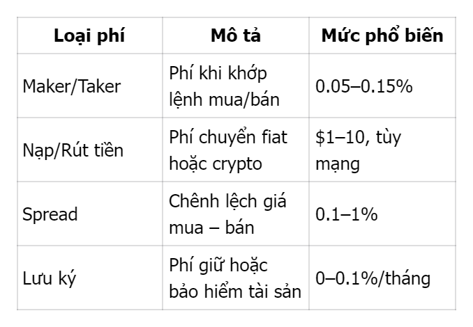 Các nền tảng cổ phiếu token hóa thường áp dụng cấu trúc phí tương tự sàn tiền mã hóa truyền thống. Nhà đầu tư có thể gặp các loại phí chính sau: