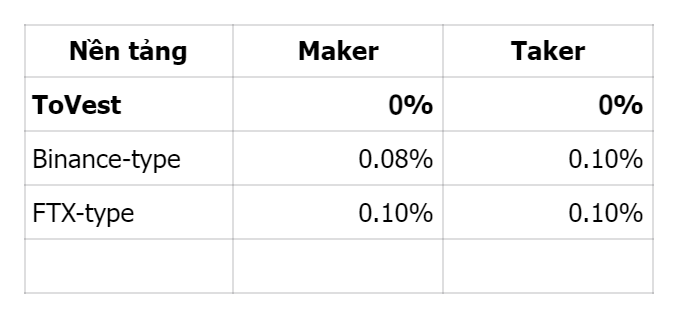 Mức chênh lệch nhỏ này ảnh hưởng đáng kể với khối lượng giao dịch lớn, do vậy việc chọn nền tảng miễn phí maker/taker có thể tiết kiệm chi phí đáng kể cho nhà đầu tư thường xuyên, đặc biệt với mô hình 0% phí như ToVest.