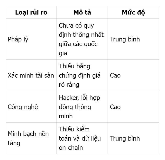 Gồm rủi ro về xác minh tài sản, thay đổi pháp lý, an ninh nền tảng và mức độ minh bạch của hạ tầng.