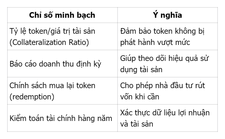 Tính minh bạch tài chính là chìa khóa để tránh rủi ro pha loãng hoặc lạm phát token. Dự án nghiêm túc luôn giới hạn số lượng token đúng với giá trị tài sản thực và công bố quy trình phát hành – mua lại rõ ràng.