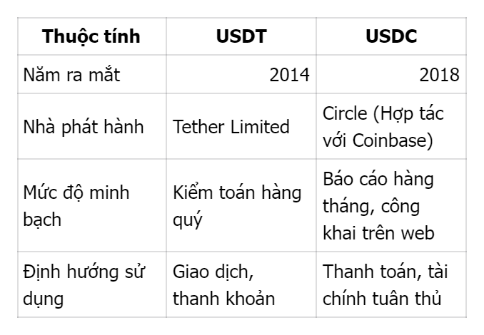 USDT được ra mắt năm 2014 bởi Tether, là stablecoin lớn nhất thế giới với tính thanh khoản vượt trội, thường được sử dụng trong giao dịch và chuyển tiền nhanh. Trong khi đó, USDC do Circle phát hành năm 2018, hướng đến sự minh bạch và tuân thủ pháp lý, được ưa chuộng trong các môi trường tài chính thể chế.