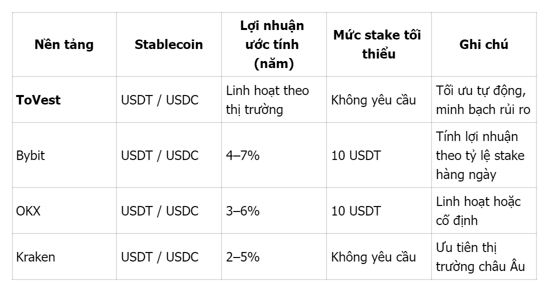 Dưới đây là tổng quan về các nền tảng được nhà đầu tư sử dụng nhiều nhất khi stake USDT và USDC, bên cạnh đó ToVest cũng cung cấp các giải pháp staking minh bạch và hiệu quả cho stablecoin.