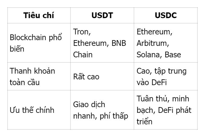 - USDC được phát hành trên hơn 16 blockchain, trong đó các mạng Layer-2 như Arbitrum hay Base giúp giảm đáng kể chi phí gas, đặc biệt hữu ích trong DeFi.